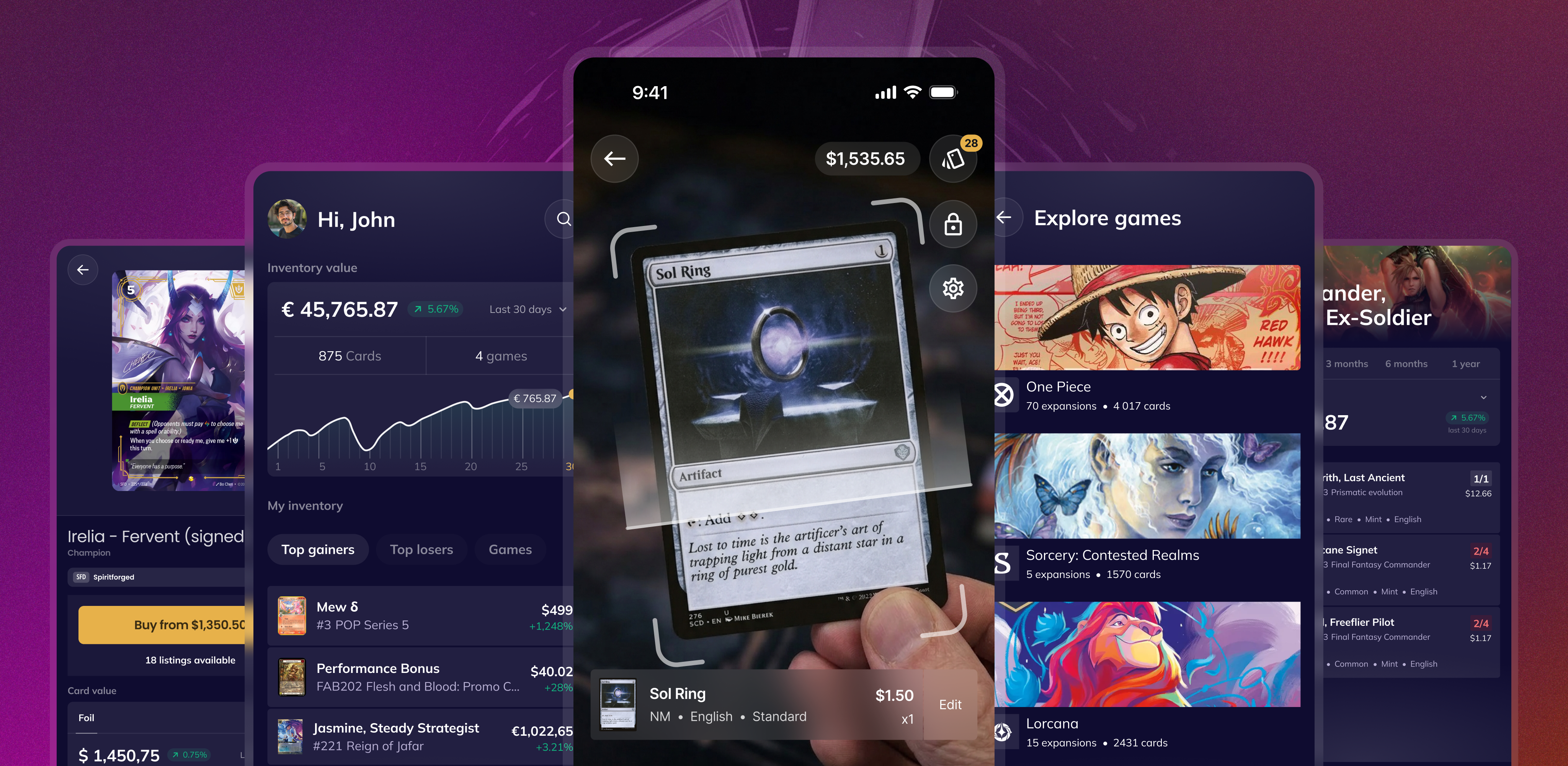 A card scanner we believe is the fastest on the market — tuned to recognize every game we support today, so you can add cards without fighting the camera.