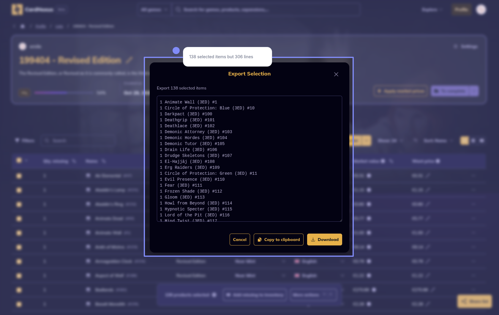 However, when I choose “Export selection” → “Export as List,” the export file contains 306 lines (the entire list) instead of only the 138 selected missing products.