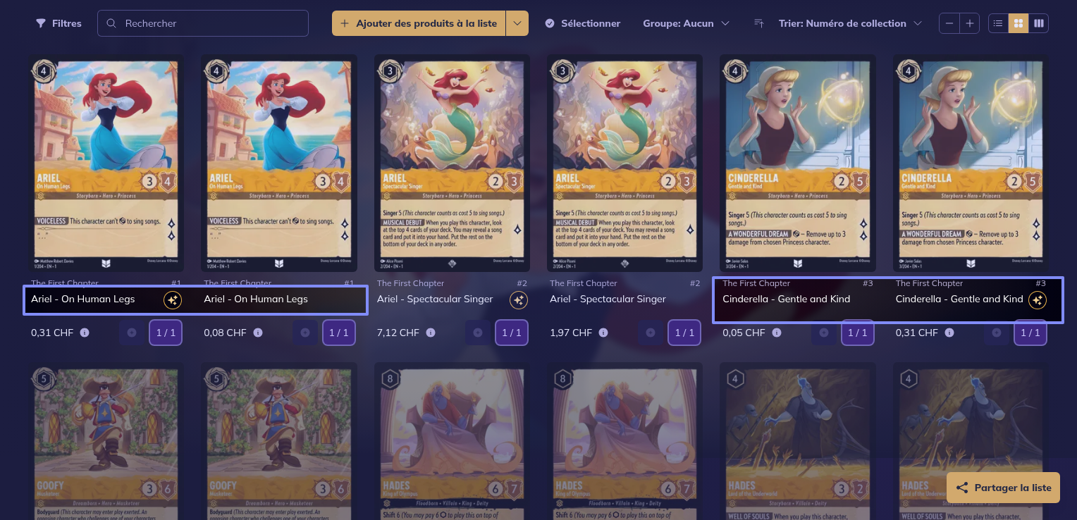 Lorsque je fait une liste pour le chapitre 1 de Lorcana afin de voir combien de % de carte il me manque, la position de la foil se trouve des fois à gauche et des fois à droite. Cela pose problème lorsque nous voulons rentrer notre collection. Si on sait que la foil est a gauche ou a droite on peut cliquer sans faire attention alors que là il faut être attentif a sa position pour ne pas se tromper.