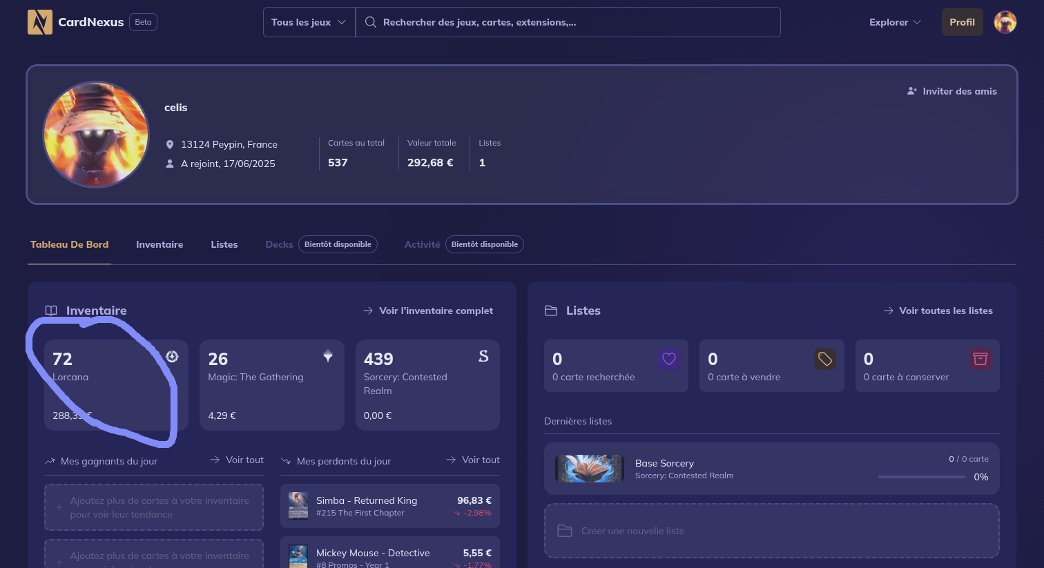 Quand on est dans le tableau de bord se serait super quand on click sur un inventaire (exemple locarna) que sa ouvre la collection lorcana uniquement