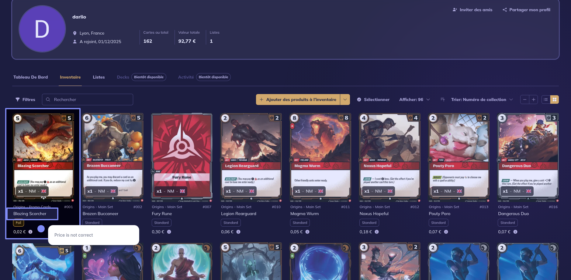 Il y a des problème de prix sur certaine cartes (RiftBound). Le prix affiché ne correspond pas.
